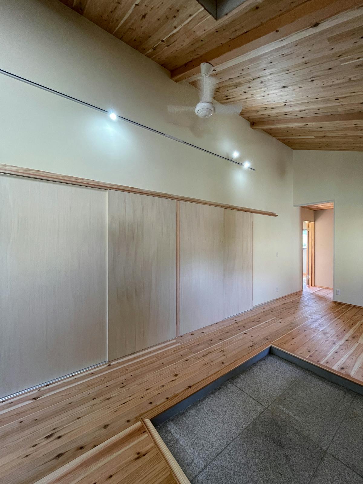 今回の施工では、床と天井に秋田杉を採用。歩行や家具の設置による摩耗を想定し、適切な厚みと仕上げを施すことで長期的に美しい状態を維持できます。