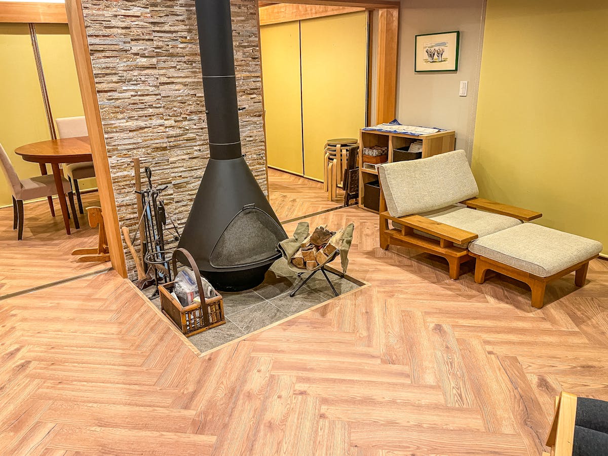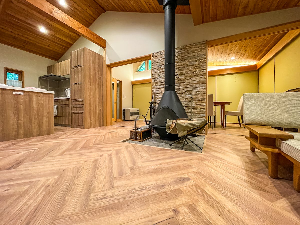 今回の施工では、ヘリンボーン張りという伝統的なパターンにより、リビング空間が視覚的に広く、かつ洗練された印象になりました。ラミネート材の利点としてメンテナンスの容易さも挙げられます。