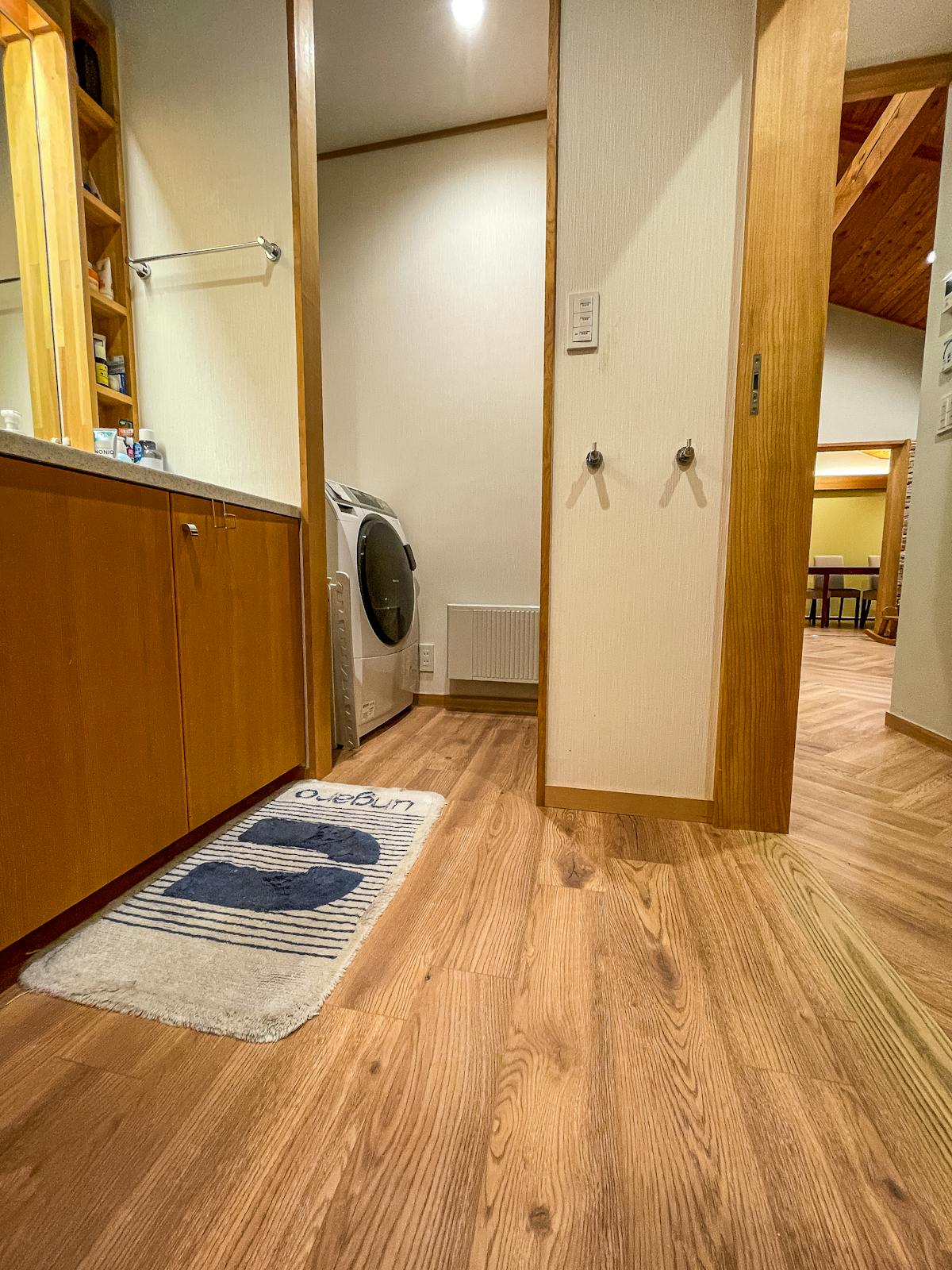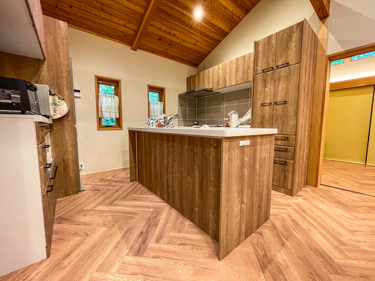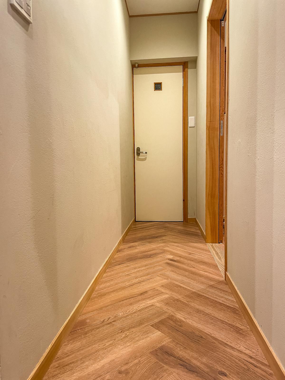 今回の施工では、リビングや廊下に伝統的なヘリンボーン張りで仕上げ、高級感とデザイン性を両立した空間を実現しています。ラミネートフローリングならではの耐摩耗性や耐水性を活かし、日常の使用にも安心な仕上がりとなりました。施工写真ではヘリンボーンの美しいパターンが際立ち、光の当たり方によって表情豊かな空間演出が可能です。