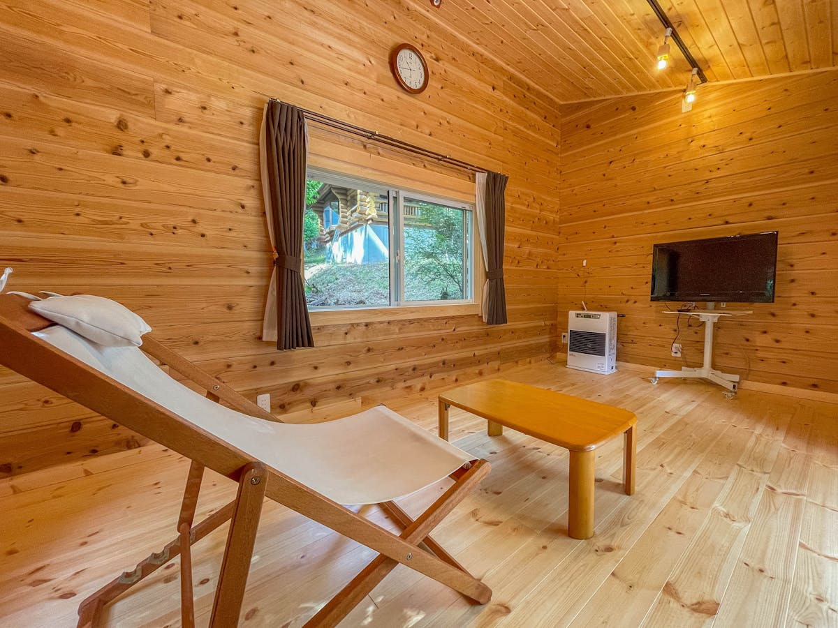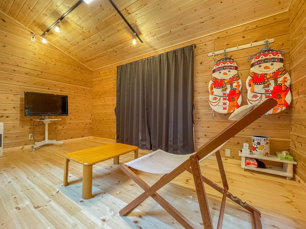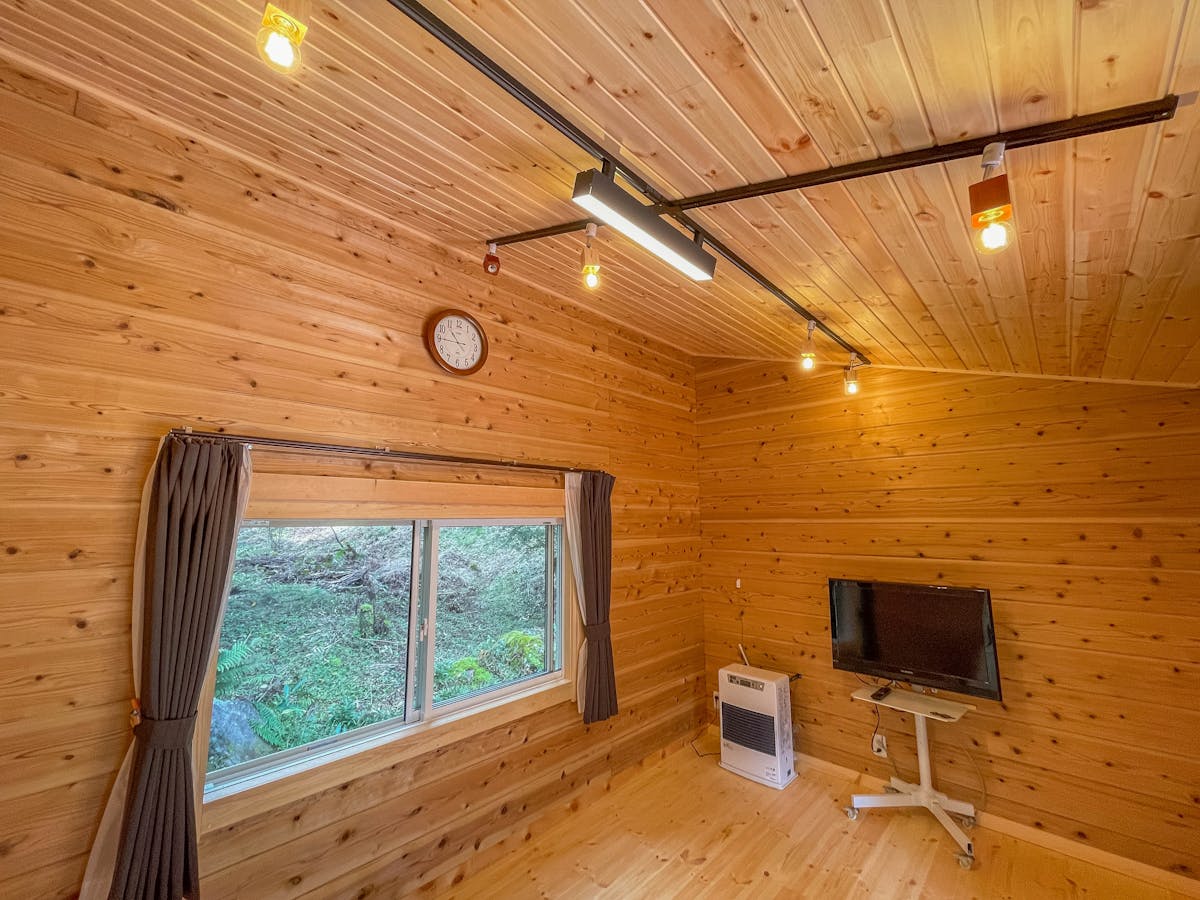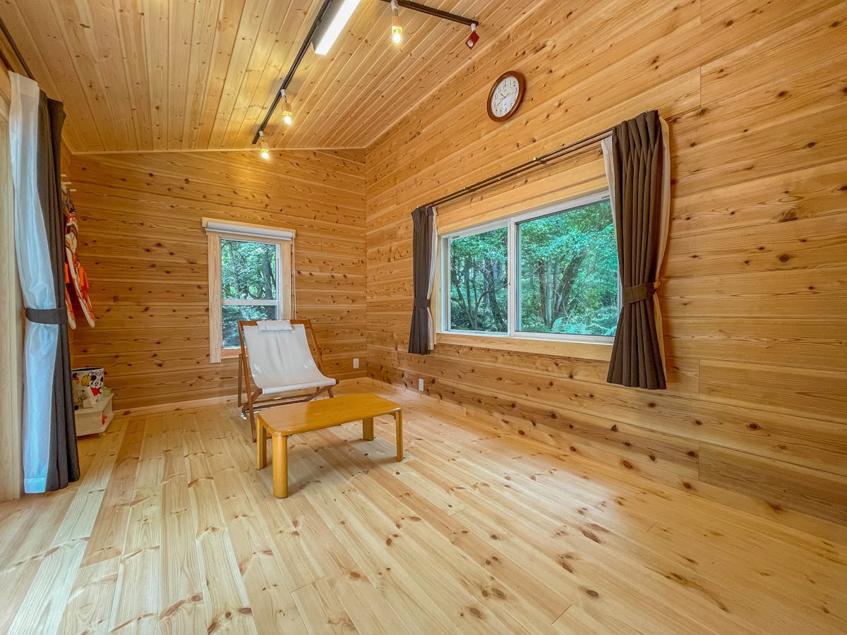 今回の施工では、ログハウスの壁・天井・床のすべてにパイン材を使用しました。パインのやさしい木目が自然に馴染み、まるで北欧の山小屋のような温もりある雰囲気が生まれています。