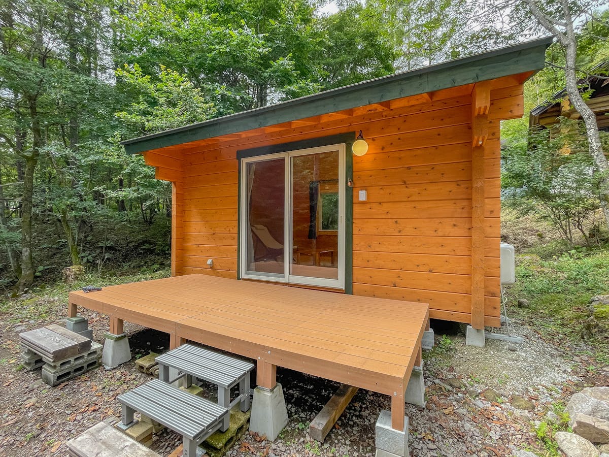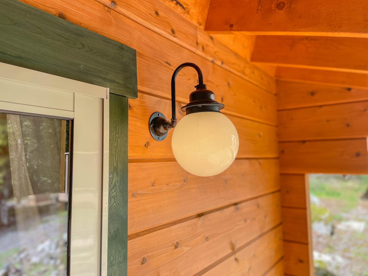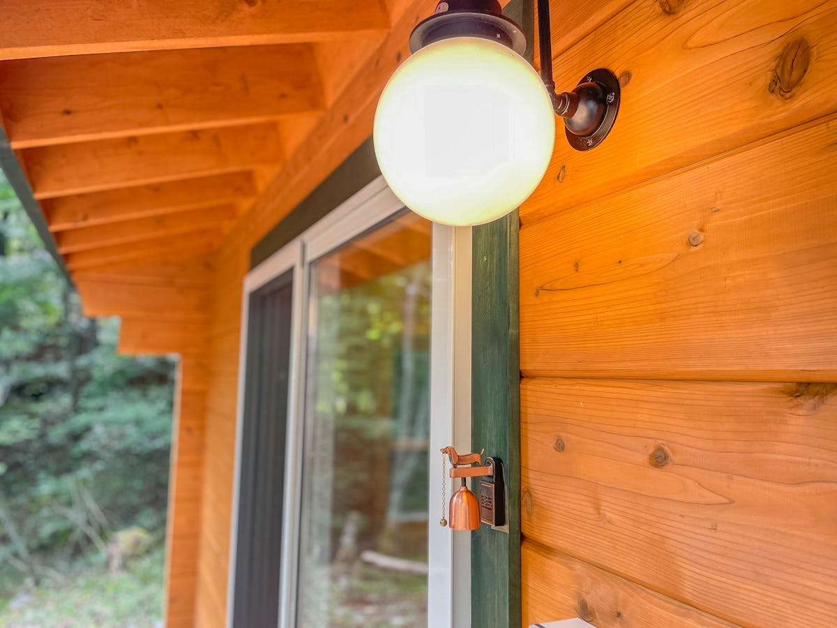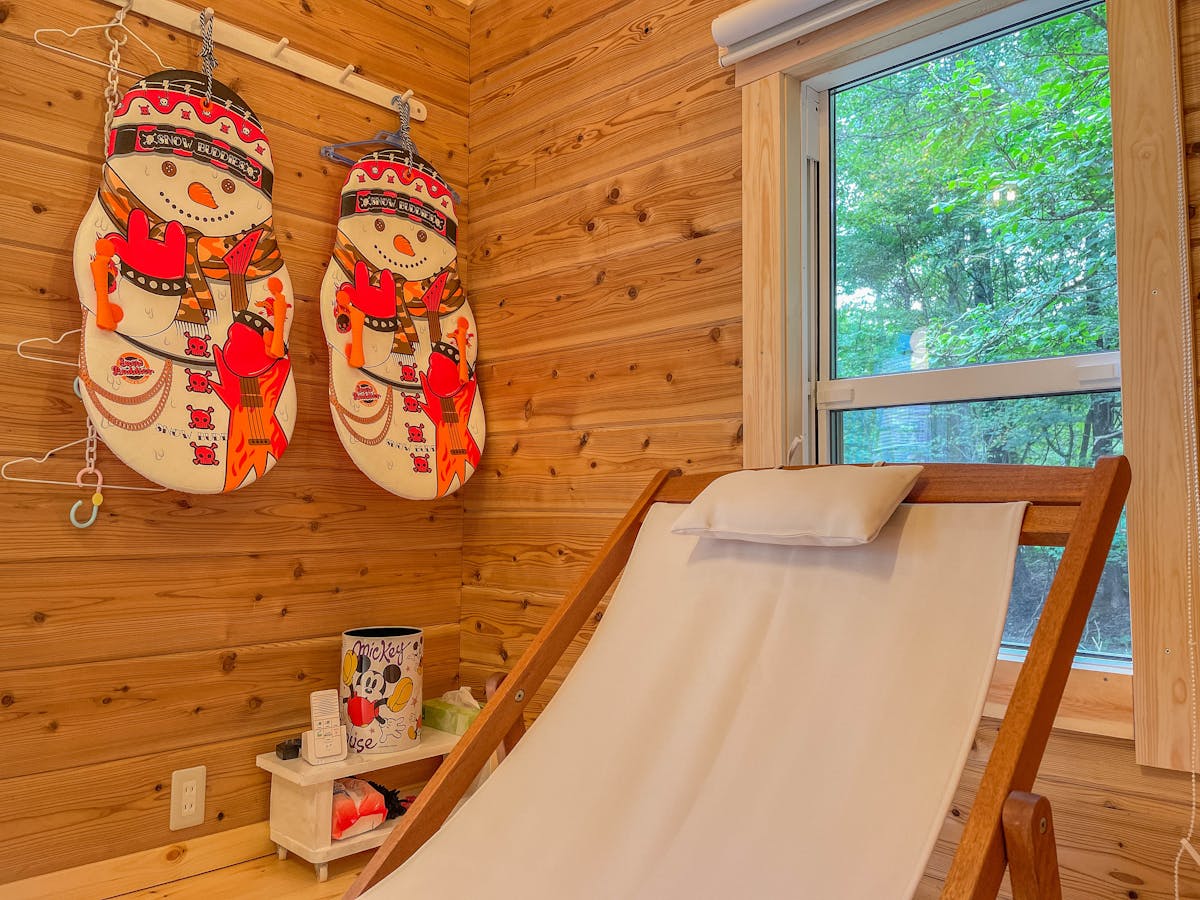 今回の施工では、ログハウスの壁・天井・床のすべてにパイン材を使用しました。パインのやさしい木目が自然に馴染み、まるで北欧の山小屋のような温もりある雰囲気が生まれています。