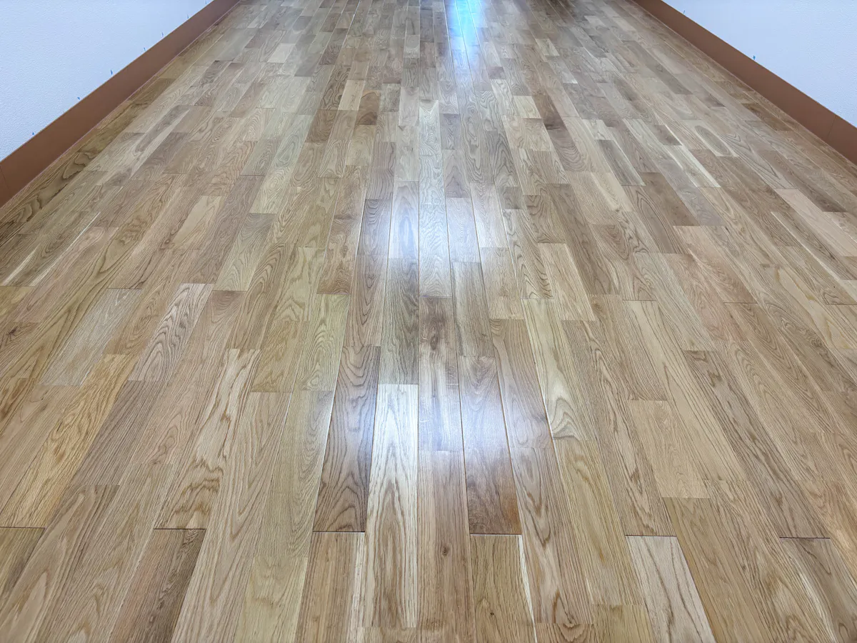 今回使用した「プレミアグレード」は、色ムラが少なく、全体的に落ち着いた均一な表情が特徴です。さらに、板の幅が「75mm」と一般的なフローリングよりも細めの規格になっています。細い幅の板を並べることで床面に直線が細かく入り、空間全体をすっきりと見せる視覚的な効果があります。