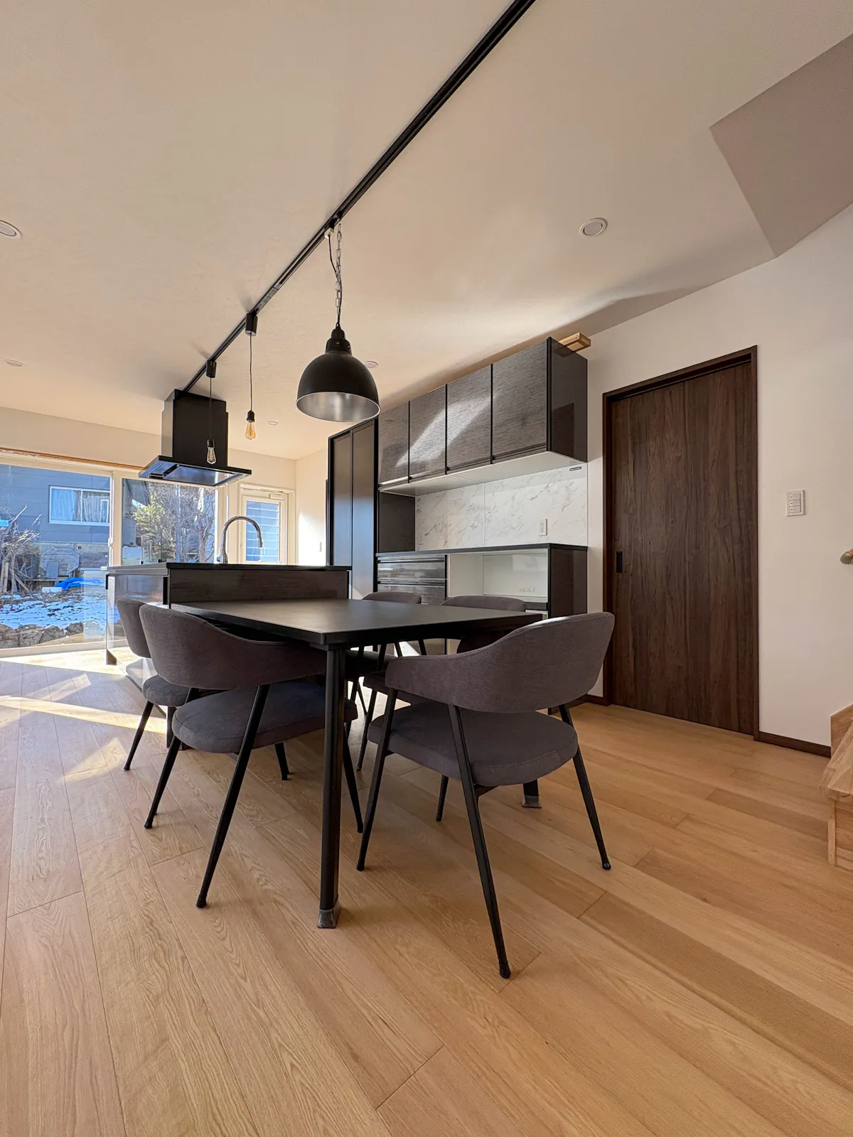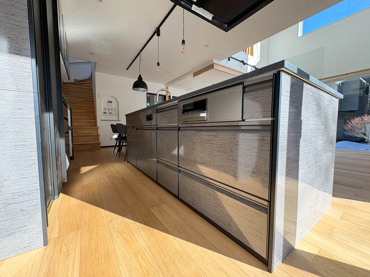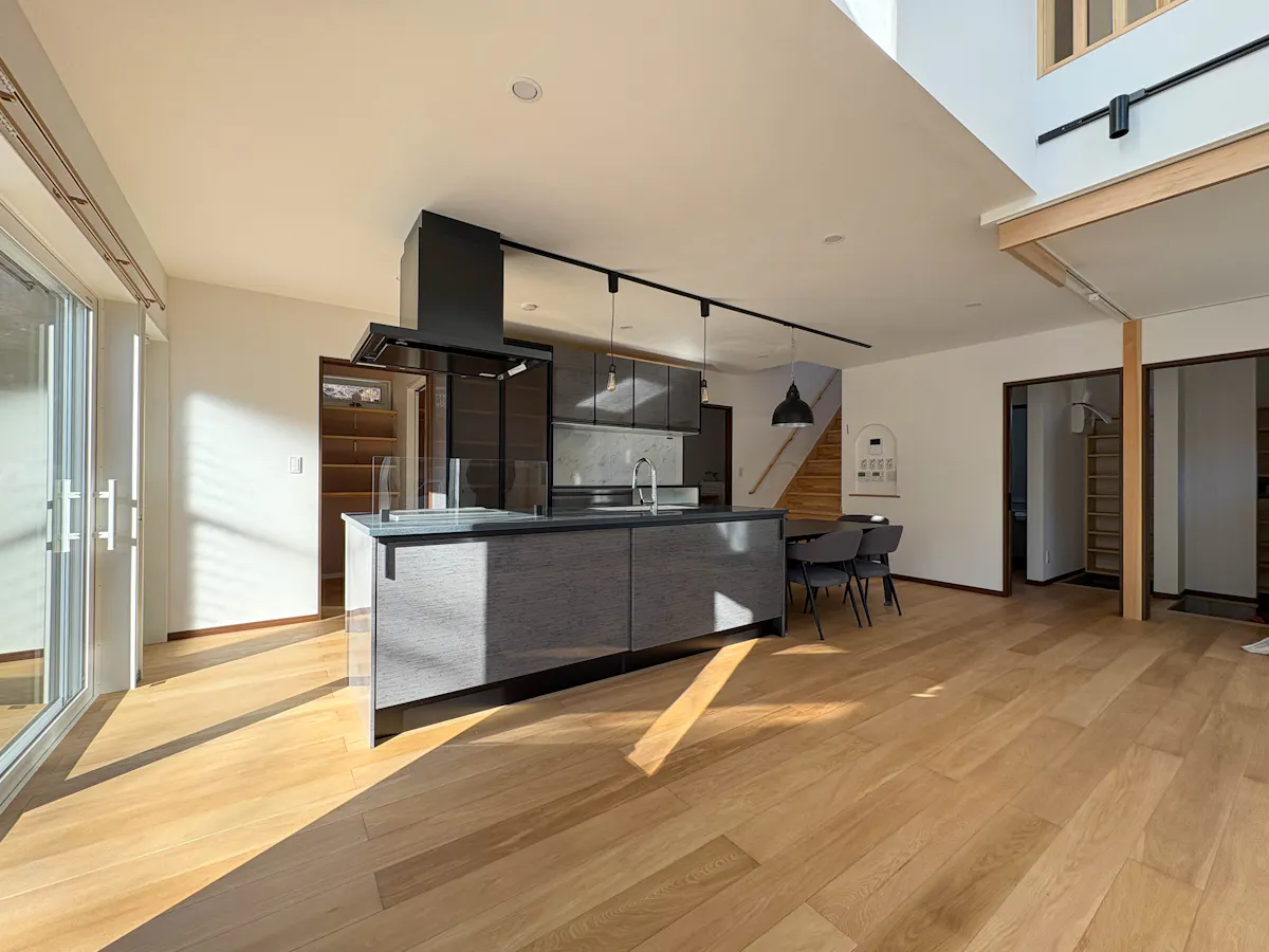 リビングやキッチンには、150mmという幅広のオーク材が用いられています。吹き抜けの白い天井がもたらす上下の開放感に加えて、幅広の床材が水平方向にもゆとりを感じさせ、空間全体をより広々と見せる効果を発揮しています。表面のオイル塗装は木肌の自然な質感を残し、太陽の光を優しく反射して室内を温かな雰囲気で包みます。また、この複合オークは床暖房に対応しているため、足元が冷えやすい冬場でも快適に過ごすことができます。