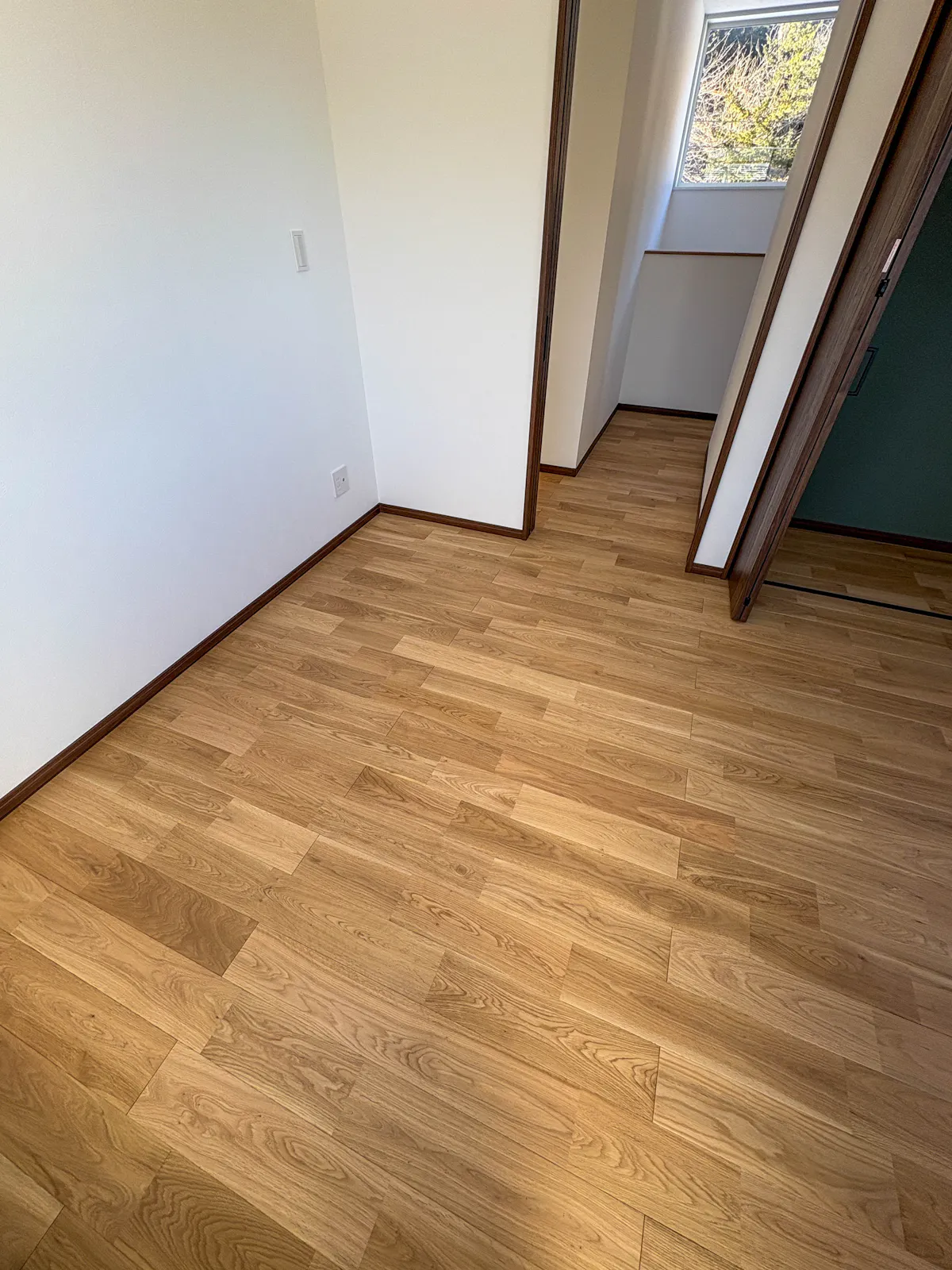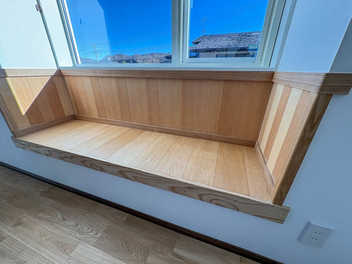 家全体のベースとなるオーク(ナラ)は、はっきりとした木目と高い硬度を持つ広葉樹です。古くから家具や建築材として親しまれてきた丈夫な木材です。今回使用した「セレクト」等級は、木の自然な色ムラを適度に残し、温かみのある表情を持っています。また、基材に合板を使用した「複合フローリング」であるため、温度や湿度による木の伸縮が少なく、安定した品質を保ちます。
