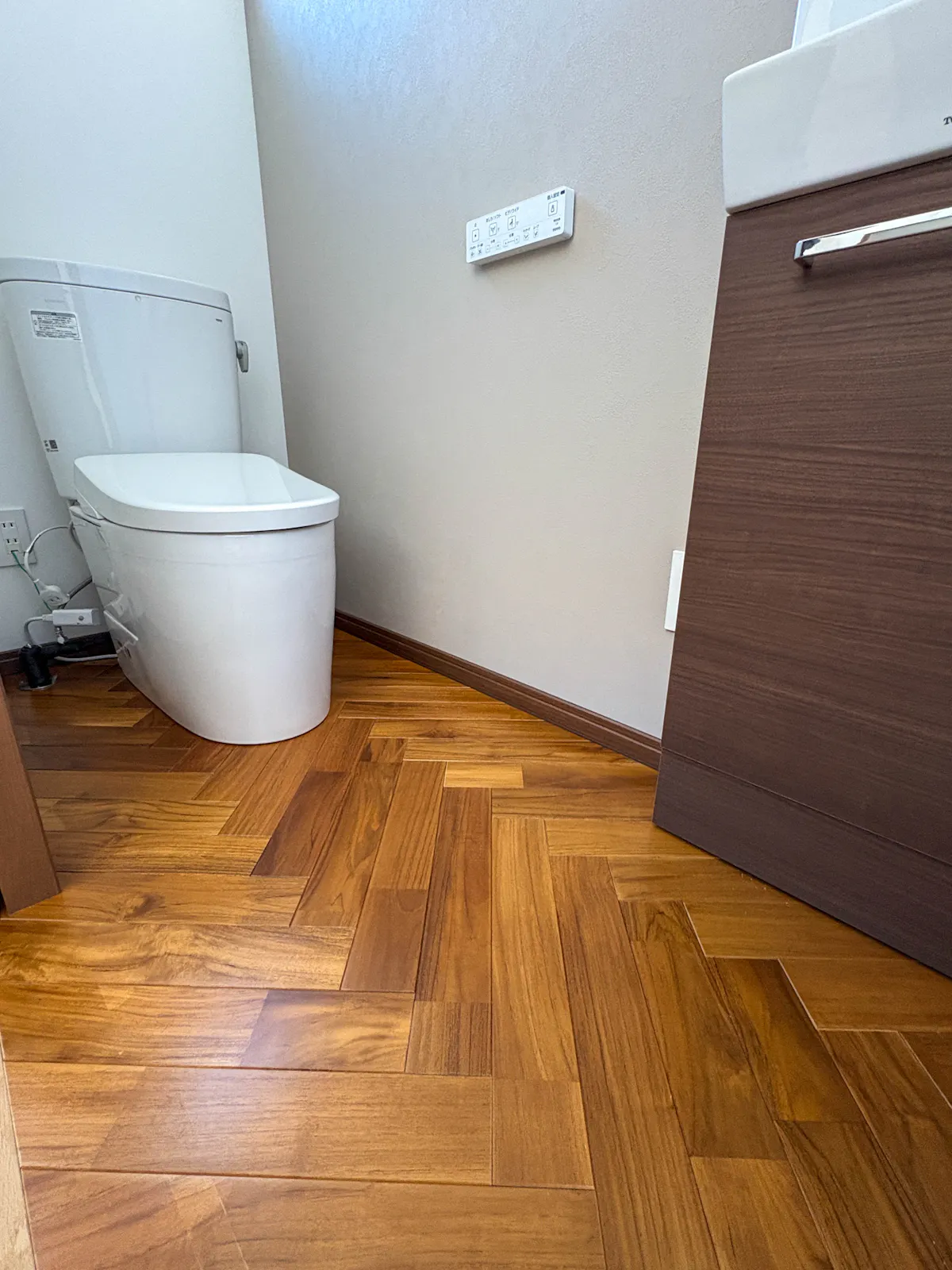 対照的に、トイレという限られた面積の空間には、75mm幅のチーク材を細かく組み合わせるヘリンボーン貼りが効果的です。視覚的な情報量が増えることで、単調になりがちな水回りの空間が、デザイン性の高い特別な場所へと変化します。